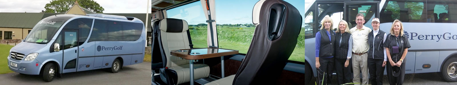 PerryGolf’s VIP Coaches, originally introduced in 1998, set the standard for small group transportation. We used a Mercedes chassis, originally designed to accommodate 20 passengers, and completely reconfigured both the interior and storage to provide an ideal environment for groups of 8 to play, relax and sightsee. It began with spacious leather armchairs, each with its own armrests and facing a table. Since then, the vehicles have evolved with different sizes but always the current amenities any traveler would reasonably anticipate. The vehicles are fully air-conditioned and equipped with a refrigerator plus an ice box stocked with soft drinks and bottled water. The secure storage area is compartmentalized with individual space for clubs, shoes and clothing that needs to hang.